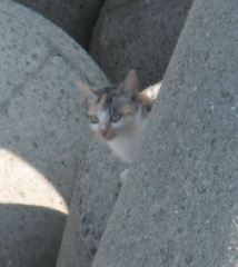 あ、帰り道で寄った海際の、テトラポットの影から出現したねこを激写!!