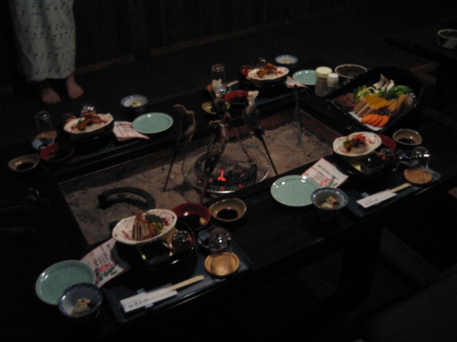 夕ご飯は囲炉裏懐石、というコースだったんだけど、すごかったよ。ほんとに囲炉裏なの。こんなん。