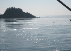 本当に、橋の下だけが白く泡立っていて、それ以外のところは非常に静かな海でした。で、その白く泡立っているあたりに船は進み、渦潮のあたりにさしかかると、舵切ってるせいもあるだろうけど結構揺れました。